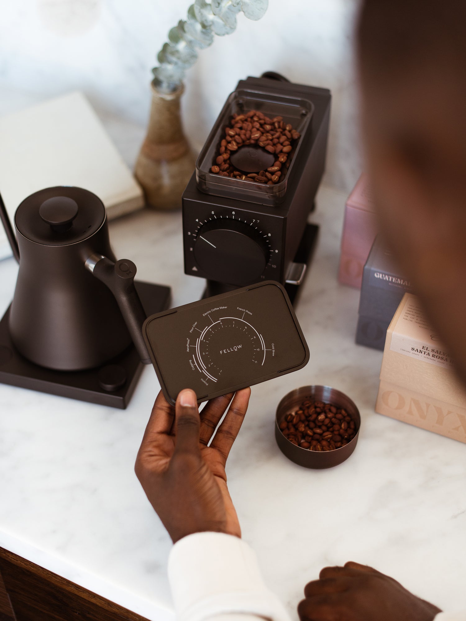 Compared to the Fellow Opus, the Fellow Ode is optimized exclusively for brewed coffee. Its compact aluminum build gives it a premium feel and weight, while delivering the highest level of precision with a quiet grind.